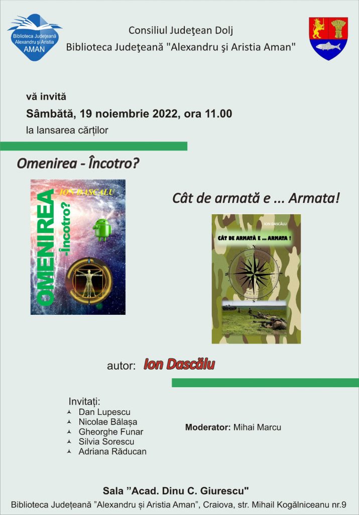 Biblioteca Județeană ”Alexandru și Aristia Aman” din Craiova, va găzdui sâmbătă, 19 noiembrie 2022, ora 11.00, în Sala ”Acad. Dinu C.Giurescu”, lansarea a încă două cărți interesante ale prolificului scriitor Ion Dascălu: ”Omenirea – Încotro?” și ”Cât de armată e … Armata!”