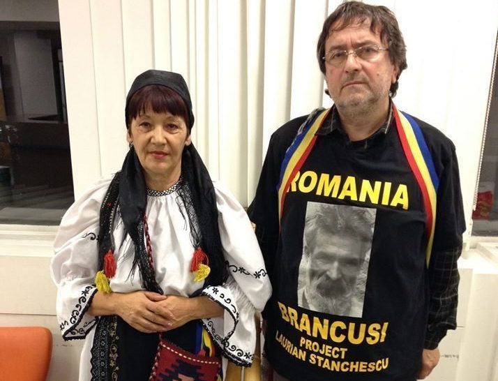 Romanian poet Laurian Stanchescu poses with a compatriot woman in Paris on November 14, 2011 after having submitted to Elysee Palace and French National assembly offices a text asking the repatriation of the remains of the Romanian sculptor Constantin Brancusi based in the Parisian Montparnasse Cemetery. Both fans of the famous sculptor died in Paris in 1957 arrived in Paris a few days ago, after a march of 2000 km from Bucharest, which began symbolically on May 21, 2011 in the village of Brancusi, Hobita. AFP PHOTO (Photo credit should read -/AFP via Getty Images)